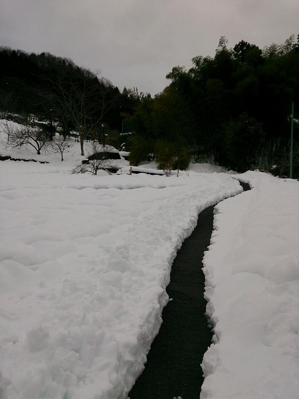 写真の道は自動車が1台通れるくらいの幅の道なのですが、すっぽり雪に埋もれてしまって、かろうじて人一人歩けるくらいの雪が掻いてありました。。。